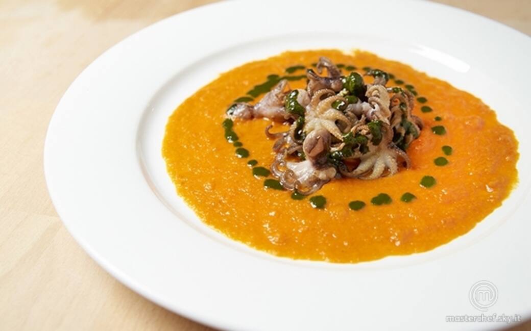 Mettere la composta di pomodori sul piatto, sopra i moscardini e a fianco un disegno di crema di basilico.