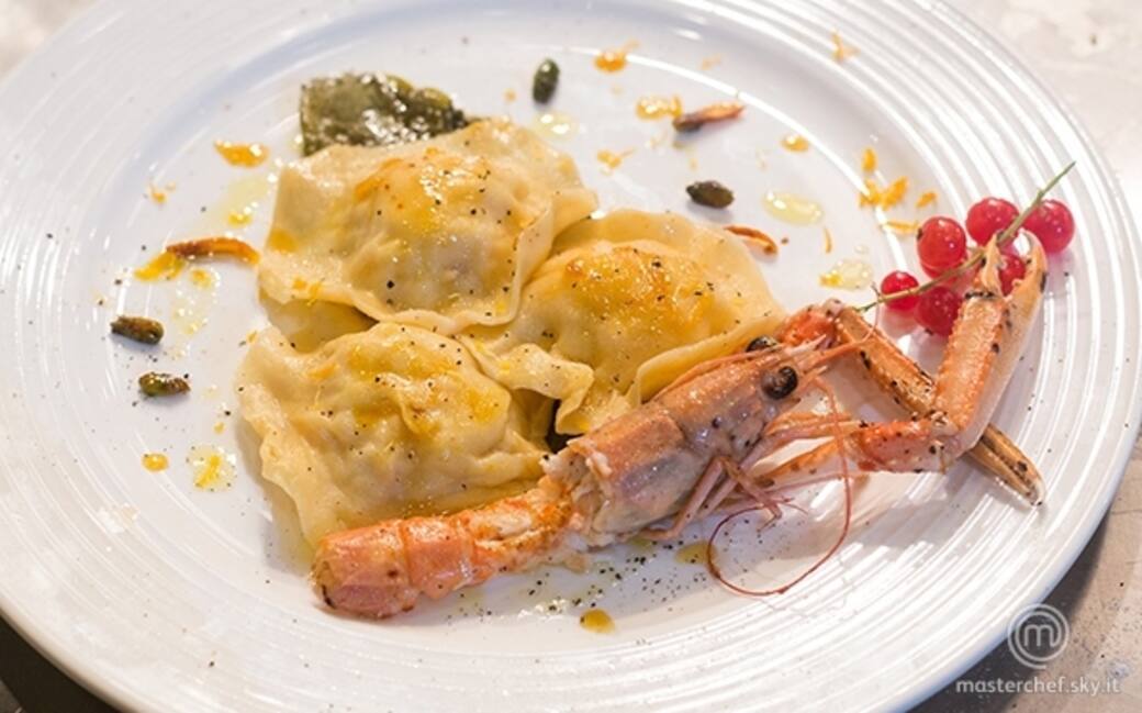 Lardellare le foglie di acetosella e gli scampi per la guarnizione del piatto. Farcire i dischi di pasta, chiuderli avendo cura di sigillare bene gli angoli del raviolo.