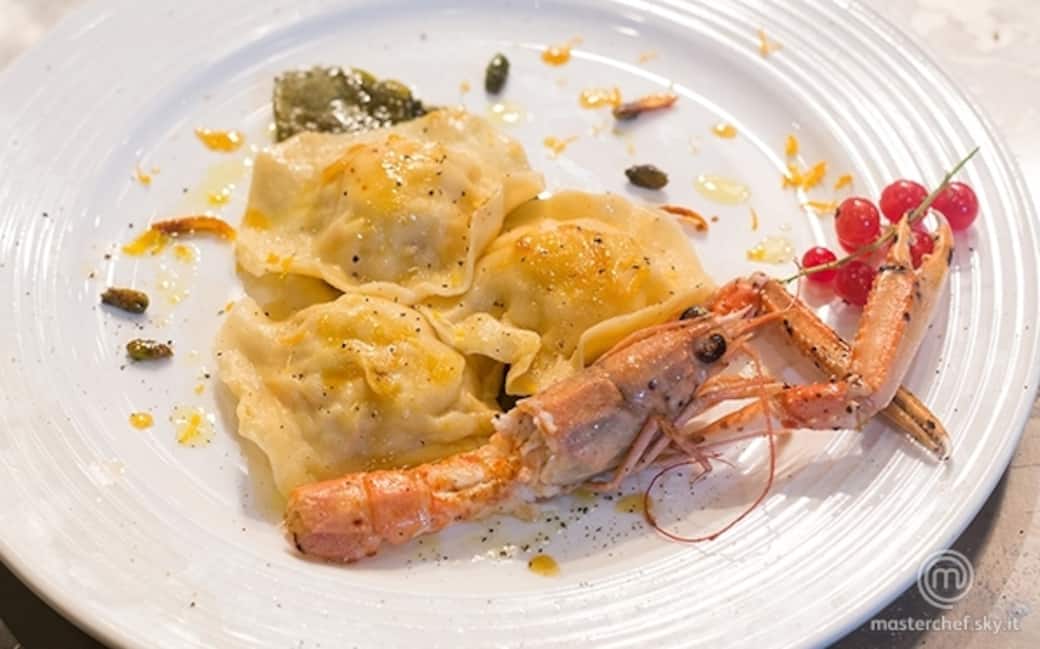 Pulire gli scampi e i gamberoni e tagliarli al coltello molto finemente.Unire alla polpa, salare, pepare, condire con spremuta d’arancia e di limone e lasciare in frigo per 15 minuti.