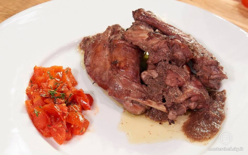 Coniglio al vino rosso con pomodorini e zabaione al caffè