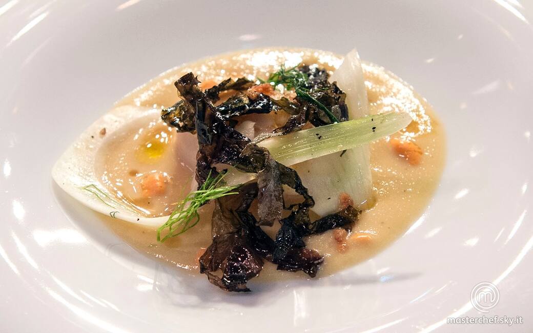 Impiattare versando uno specchio di crema di ceci, disporre le capesante, due fette di finocchio, qualche goccia di sciroppo e qualche goccia di maionese al corallo. Completare con una grattugiata di bottarga, qualche alga croccante e qualche foglia di finocchietto per decorare.