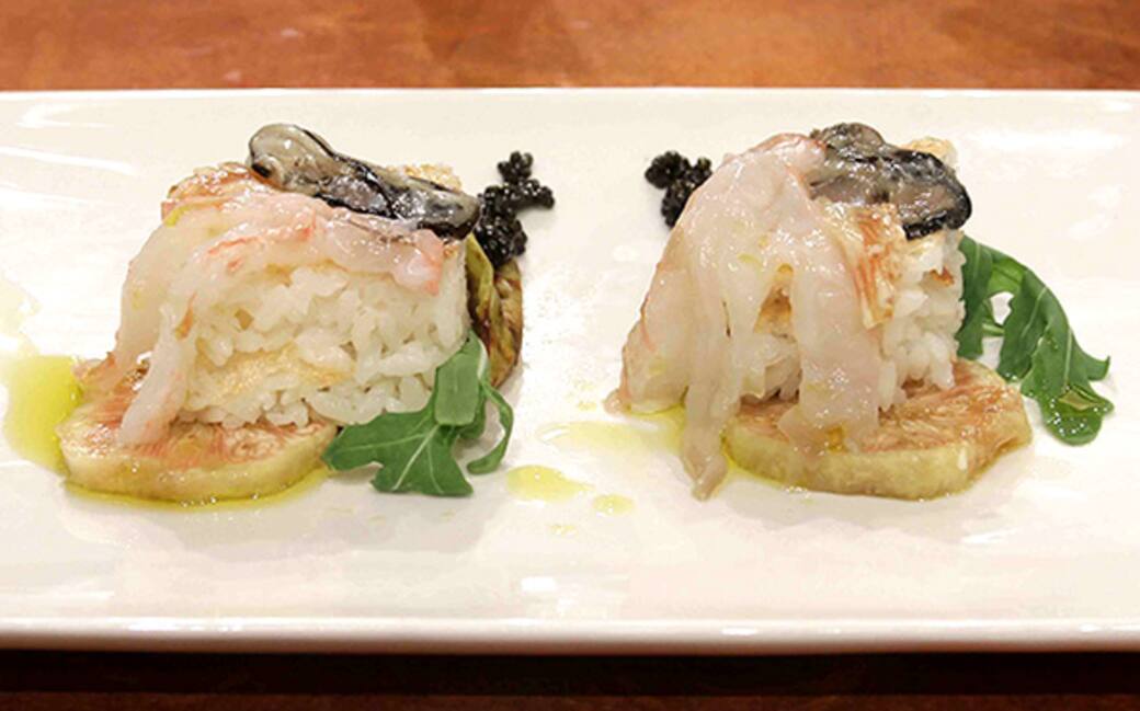 Servrisi del coppapasta per creare 2 medaglioni di riso, formare con la melanzana un cono e posizionarlo nel piatto; inserire il riso nella cavità. Adagiare sul riso lo scampo sgusciato e l'ostrica.