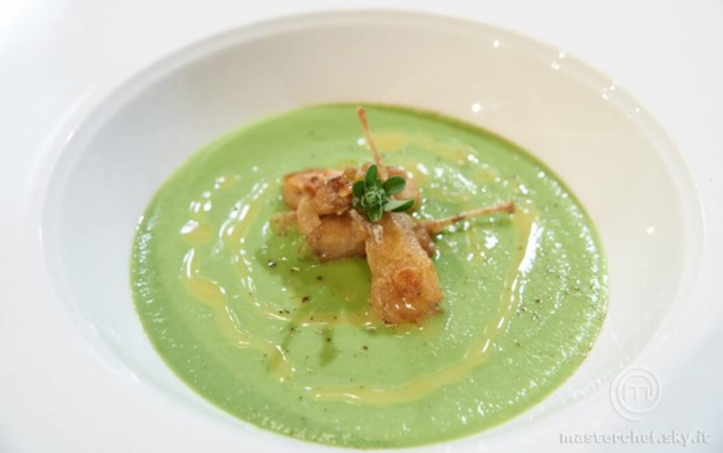 Frullare i piselli insieme a qualche fogliolina di maggiorana, passare la salsa al colino. In una padella mettere dei fiocchetti di burro e cuocervi le cosce, rosolare su tutti i lati. Impiattare: per prima cosa versare la crema di piselli, sopra disporre le cosce di rana, nappare con della salsa al burro, terminare con una grattata di pepe e due foglioline di maggiorana.