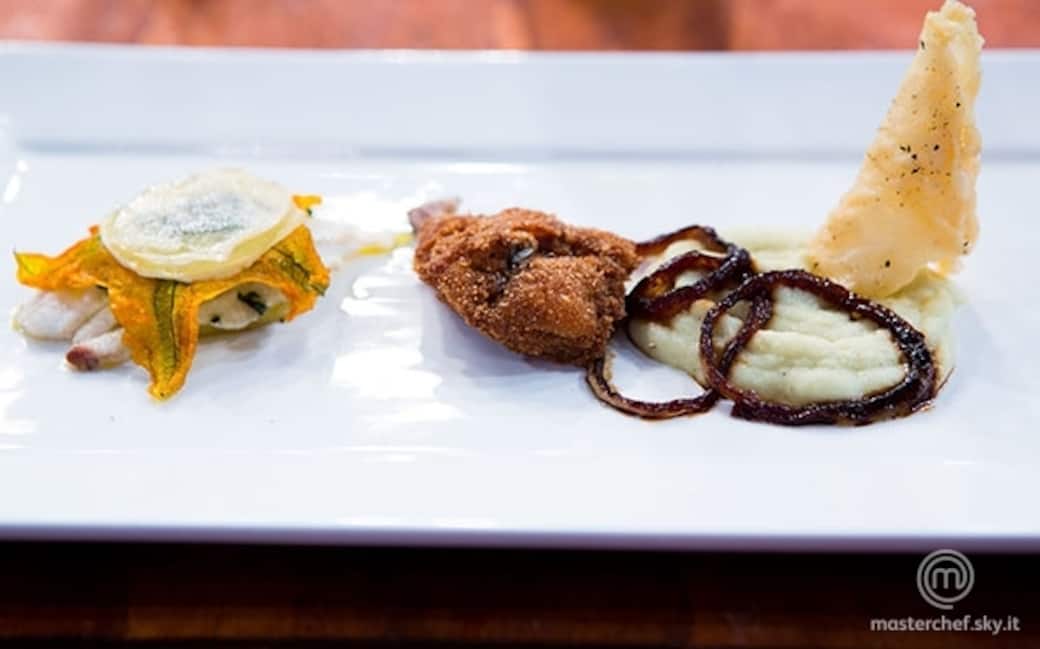 Comporre la millefoglie di patata alternando a strati la patata cotta al forno, la crema di ricotta e basilico, la sogliola e il fiore di zucca. Sul fondo del piatto adagiare la crema di sedano rapa, le cipolle caramellate al balsamico e il cono di parmigiano. Al centro del piatto posizionare la coscetta di quaglia fritta.