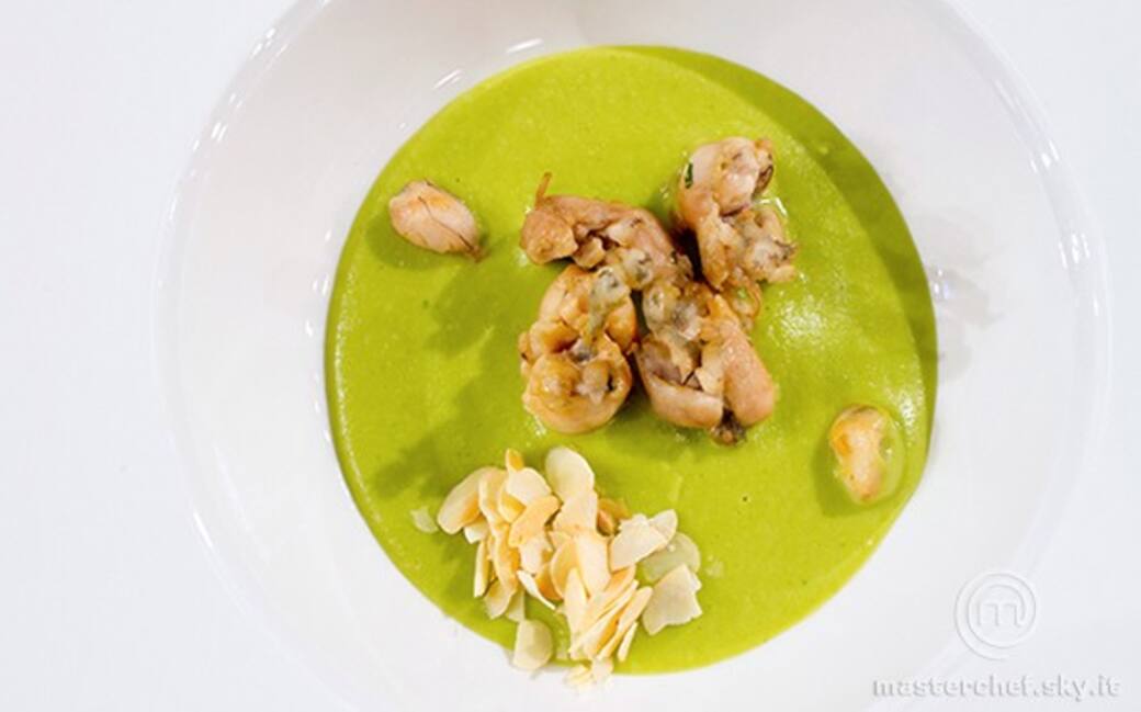 Sbollentare i piselli in acqua salata per 15 minuti, scolarli e saltarli in padella con olio, un trito misto di scalogno e porri per 3 minuti. Continuare la cottura aggiungendo poca acqua. Aggiustare di sale e frullare il composto con il frullatore a immersione. Aggiungervi una noce di burro e filtrare il tutto con un setaccio per ottenere una crema di piselli omogenea.