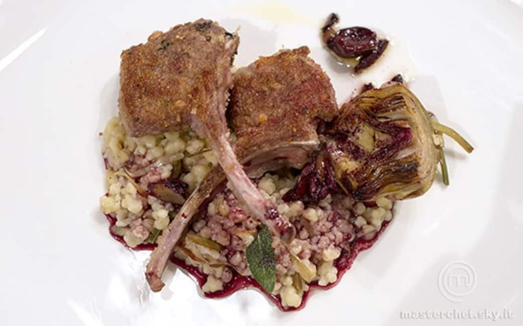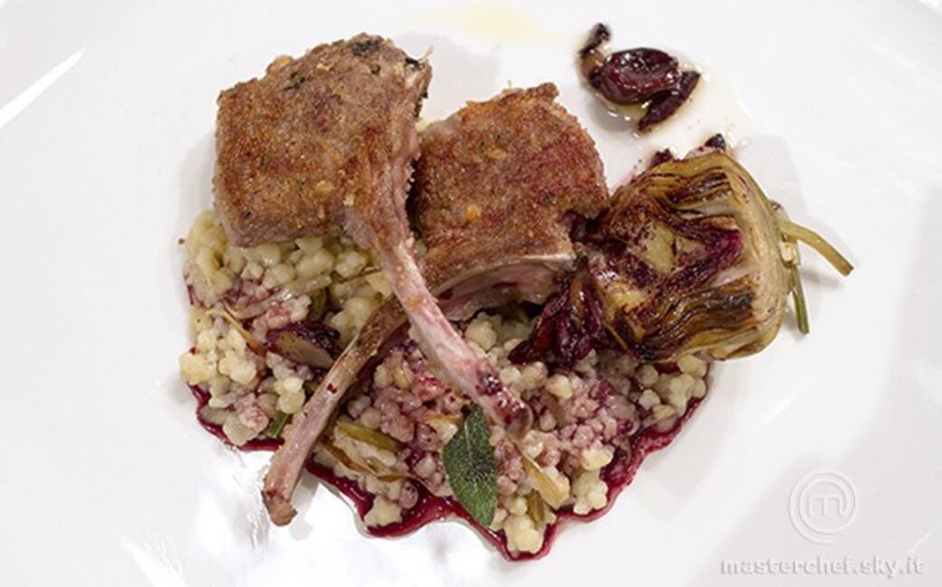 Porre al centro la fregola formando una mezzaluna; adagiare sopra le costolette d’agnello e a fianco metà carciofo. Terminare il piatto con un po’ di riduzione di vino e un filo d’olio.