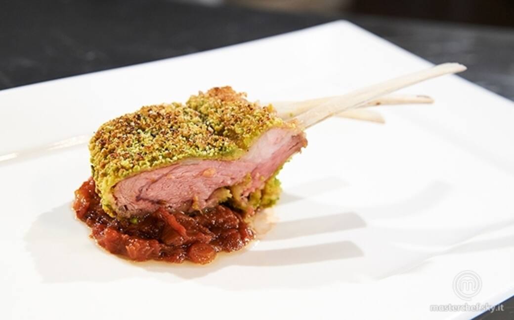 Costolette d’agnello in crosta di pistacchi e chutney di rabarbaro e fragole