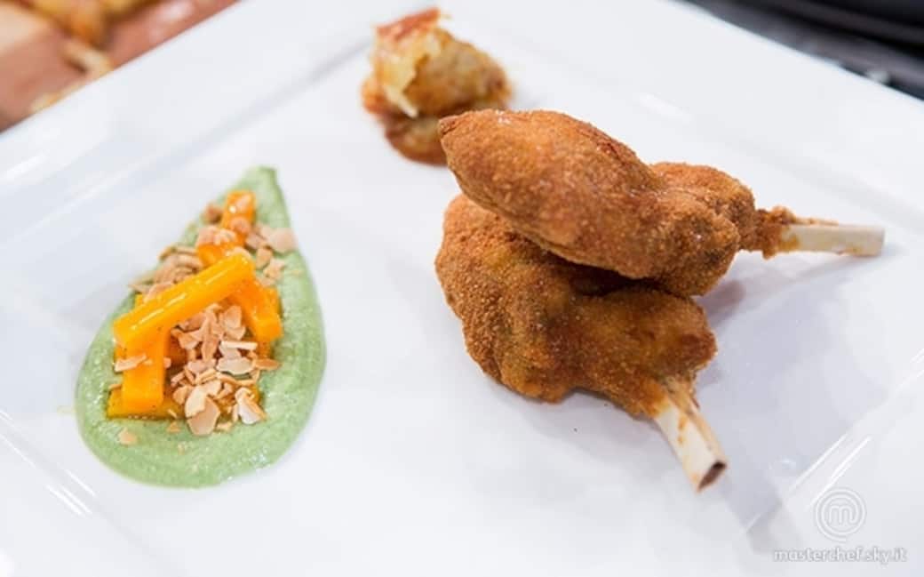 Impiattare sul fondo la vellutata di broccoli, adagiarvi sopra le lamelle di mandorle e le carote. Disporre le cosce sovrapposte in un lato del piatto e le patate croccanti in modo casuale.