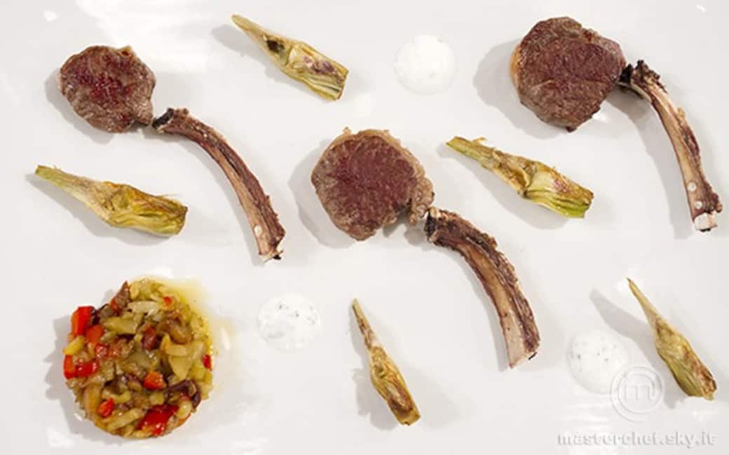 Preparare una salsa con aceto, yogurt, sale, pepe e menta. Impiattare i medaglioni d’agnello, gli ossi, i carciofi e la salsa alla menta.