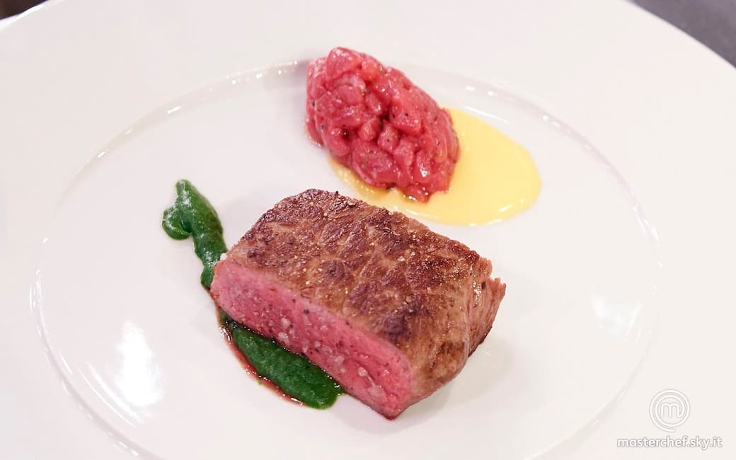 Realizzare delle rondelle di patate e metterle a bollire in acqua insieme al cavolo nero e alla cipolla. Tagliare a pezzi grossolani la pancetta e rosolare in padella. Rifilare il controfiletto e tagliarne una piccola tartare e aromatizzare con zest di lime e mettere da parte.