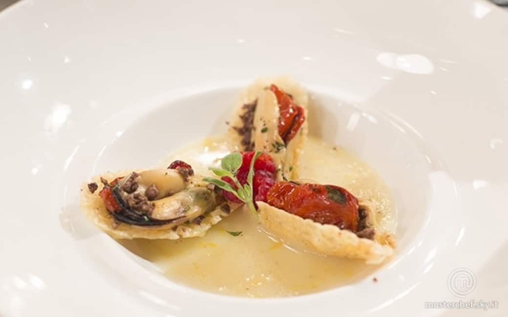 In un piatto versare poca salsa a specchio, impiattare tre cialde ciascuna con una cozza all’interno, foderarla con una fettina di pomodorino e pochissime olive tritate e rifinire con una grattugiata leggera di scorza di limone.