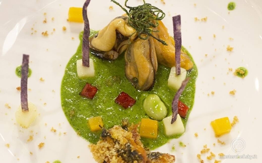 Comporre il piatto con al centro la schiuma di prezzemolo, le cozze gratinate da una parte, le cozze condite dall'altra e aggiungere le verdurine a piacere.