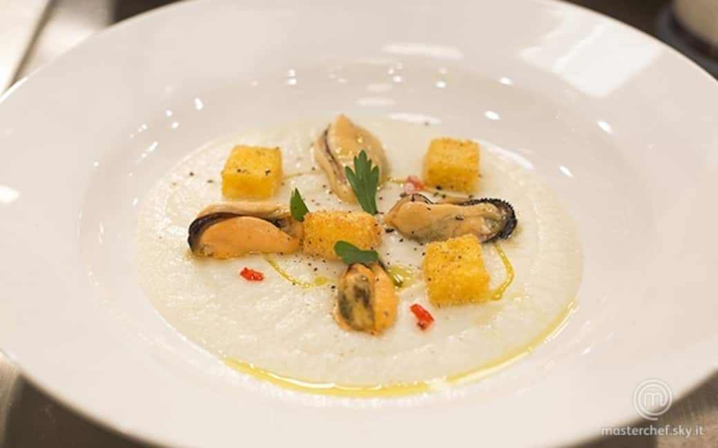 Frullare i cavolfiori con poca acqua delle cozze e la loro acqua di cottura: stare attenti alla sapidità. Impiattare.