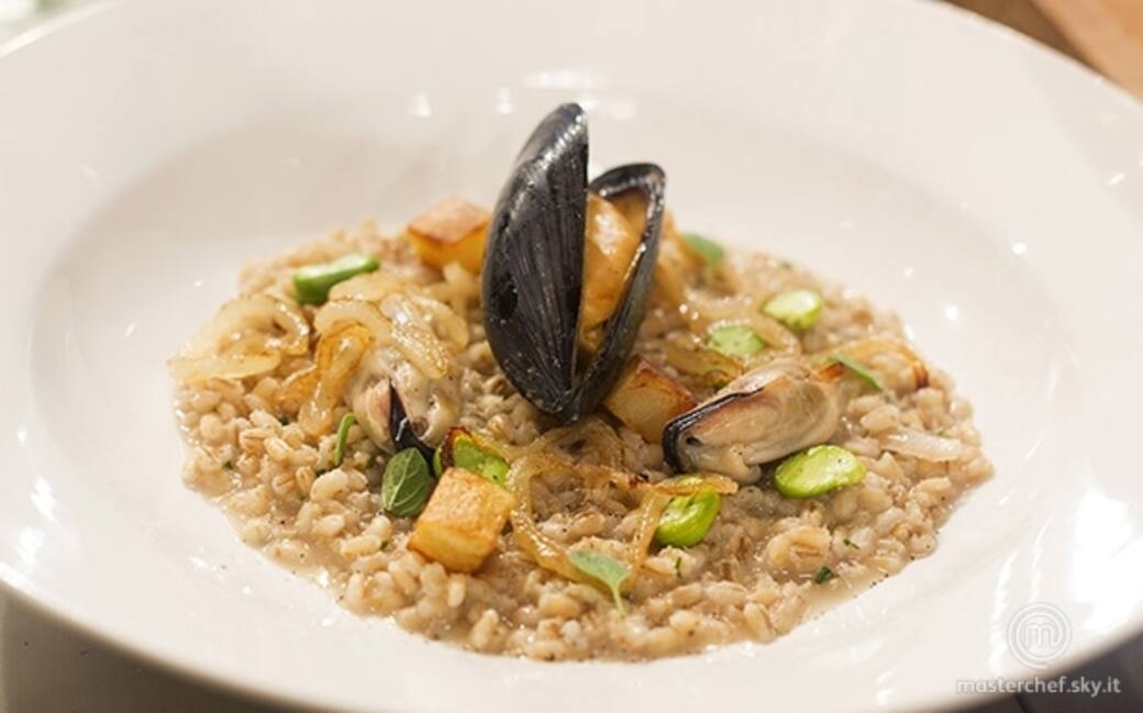 Preparare il fondo di olio, aglio e peperoncino e soffriggere. Quando caldo aggiungere le cozze preventivamente pulite e lasciare aprire con un coperchio. Levare le cozze dal guazzetto che si è formato, filtrarlo e riutilizzarlo per cuocere l'orzo per circa 45 minuti.