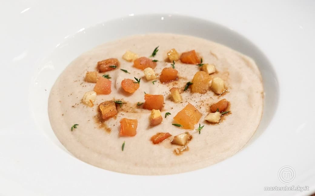 Servire la crema di fagioli aggiungendo i cubetti di pomodoro e di mela. Decorare con gocce di aceto balsamico e foglie di timo.
