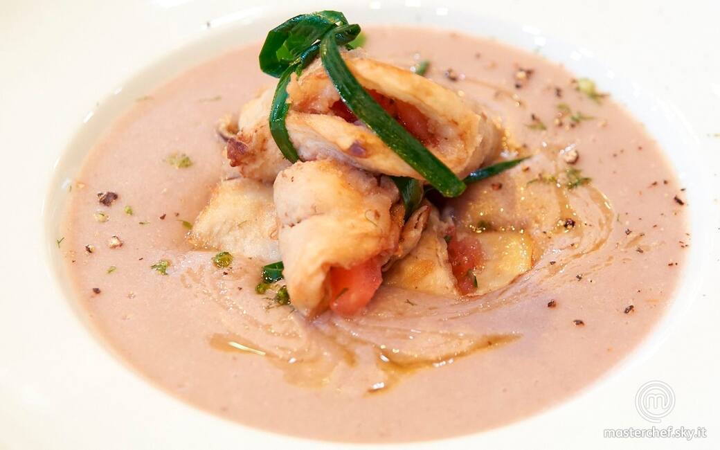 Impiattare la crema di fagioli e adagiarvi sopra gli involini. Aggiustare di olio evo, sale e pepe.