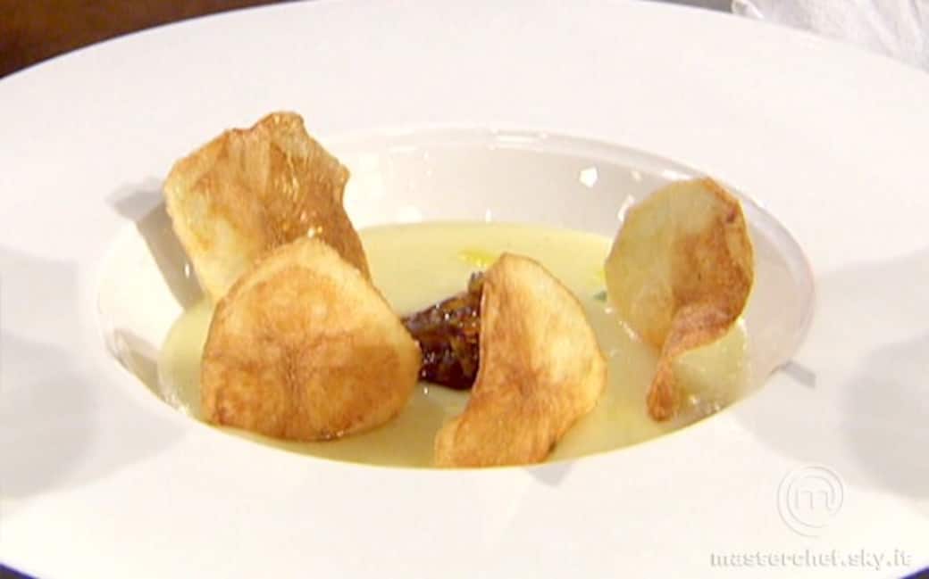 Impiattare: disporre sul fondo la crema di patate, al centro un cucchiaio di cipolle, qualche goccio di olio evo aromatizzato, una macinata di pepe e 5 chips disposte verticalmente. Servire l’infuso a parte.