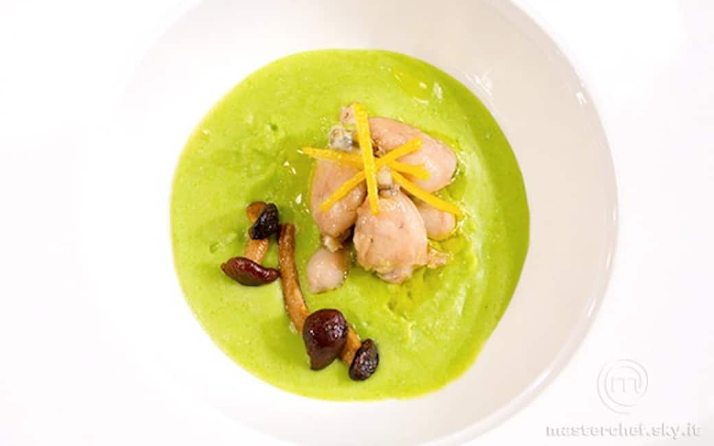 In un’altra pentola scottare per pochi minuti i piselli in acqua salata bollente. Non appena saranno cotti, ma ancora verdi e croccanti, scolari in acqua e ghiaccio. Frullare i piselli con la loro acqua di cottura, il succo di mezzo limone, olio evo. Salare e pepare. Passare al setaccio.