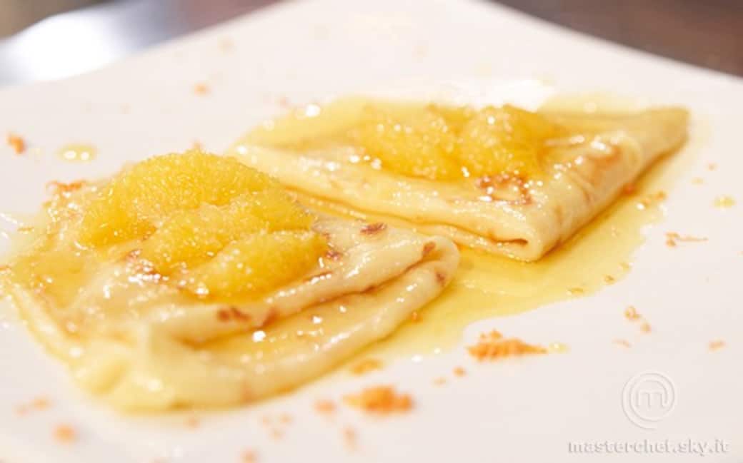 Preparare la salsa: tagliare le estremità di due arance, togliere il bianco e ottenere gli spicchi. Spremere le altre tre arance. Mettere una padella sul fuoco con 4/5 cucchiai di zucchero e aggiungere il succo. Aggiungere in padella un pezzettino di burro e aggiungervi poi le fette d’arancia senza farle disfare e muovendo la padella. Aggiungere del liquore d’arancia e, con l'aiuto di un accendino o di un fiammifero, dare fuoco. Togliere le fettine d’arancia.