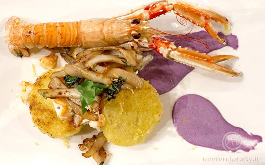Per la preparazione del ragù, far soffriggere uno spicchio di scalogno, 2 spicchi d’aglio, e dopo 1 minuto versare qualche pomodorino lavato e tagliato a metà. Pulire gli scampi eliminando la testa, il guscio e il filetto nero, sciacquarli e tagliarli a pezzi grossolani e infine metterli a marinare con l’aceto giapponese e l’olio. Sciacquare la seppia sotto l’acqua e ricavare dei cubetti di circa 1/2 cm. In una padella far appassire uno scalogno tritato con un po’ d’olio, alzare la fiamma e aggiungere un pizzico di sale, un ciuffetto di basilico e far cuocere per 10 minuti. Mischiare i due “soffritti” e servire con le crocchette di patate.