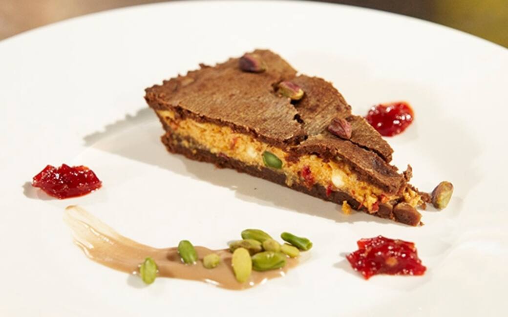 Stendere la sfoglia e farcirla con la crema di marroni, la composta precedentemente ottenuta, e una manciata di pistacchi. Chiudere con un altro disco di pasta e spennellare con la crema di marroni e latte.
