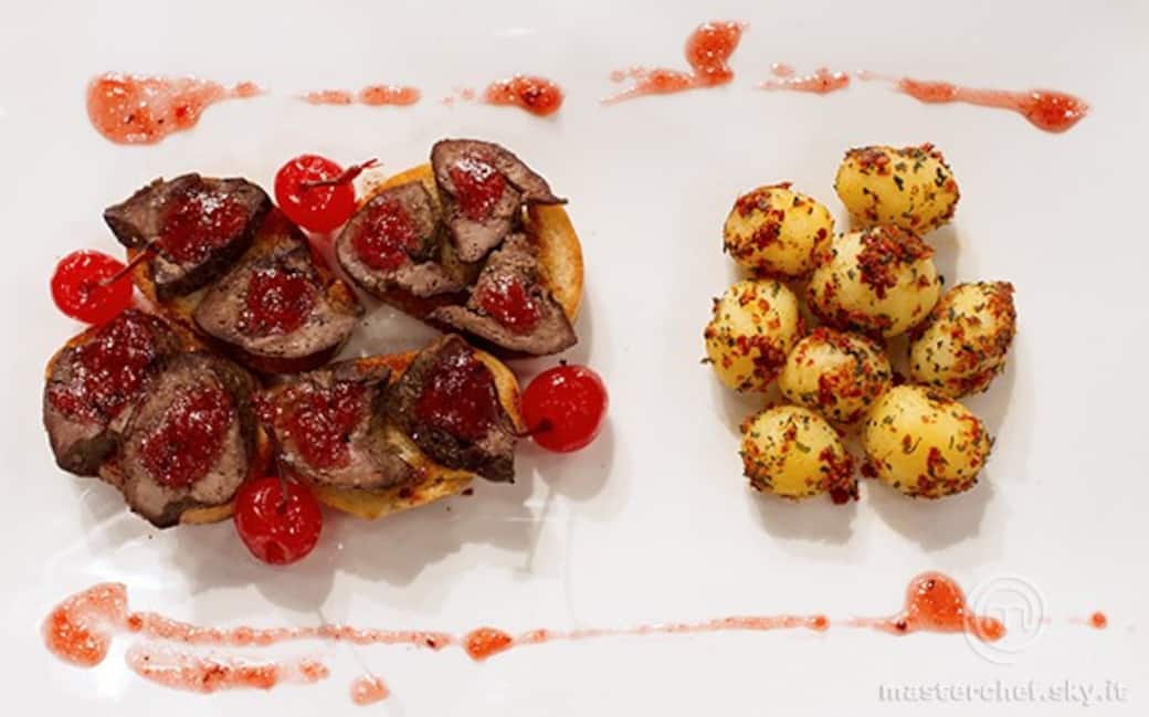Disporre i crostini nel piatto e porvi sopra i fegatini. Bagnarli con la salsa di ciliegie. Porvi accanto le patate.