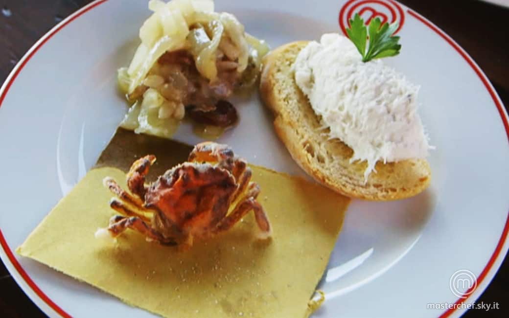 Crostino con baccalà mantecato, sarde in saor e moeche fritte della Brigata Rossa