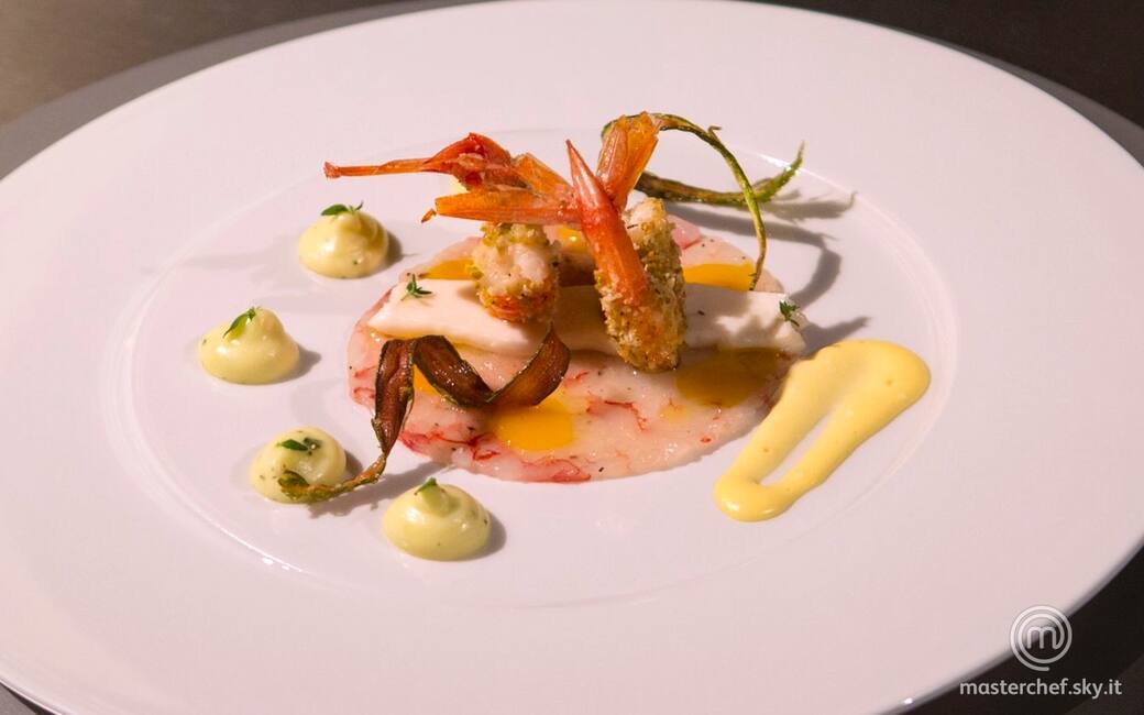 Disporre il disco di gamberi sul piatto al centro e lasciarlo scongelare, fare un a riga di mousse di capesante al centro, fare dei punti di mango e passion fruit sul gambero crudo, Fare 2 spuntoni di purè alla menta, qualche punto di maionese e disporre i fili di asparago croccante, in fine disporre le 2 code di gambero al centro del disco di gamberi crudi.