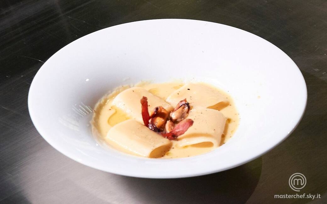 Impiattare versando sul fondo del piatto la crema di fagioli. Aggiungere i paccheri, qualche cozza, la pancetta croccante. Aggiustare di olio evo, sale e pepe.