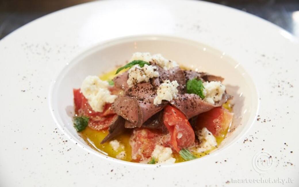 Impiattare: disporre il pomodoro al centro del piatto e poggiarvi sopra il cuore, sopra la mozzarella e dell’olio tiepido, del liquido di mozzarella e infine una foglia di menta e polvere di caffè.