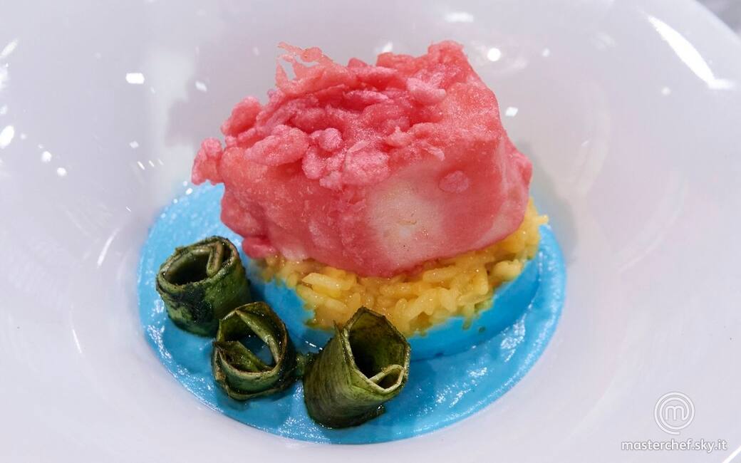 Saltare il riso in una padella aggiungendo l’acqua del cavolfiore e lo zafferano per 2 minuti. Nel frattempo preparare una pastella con la farina, 80 ml di acqua e la barbabietola in polvere. Portare abbondante olio di semi a 160 °C, passare il baccalà nella pastella e friggerlo fino a doratura. Scolare e tenere da parte.