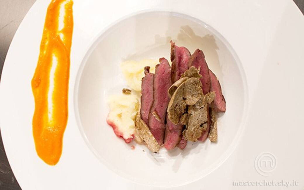 Impiattare una semisfera di purea accanto a una semisfera di maionese al caffè e adagiare al di sopra il cuore scaloppato. Salare leggermente. Decorare con lamelle di tartufo nero su cui far cadere poco olio caldo con un pizzico di sale. Porre accanto, sul bordo del piatto, la salsa di habanero.
