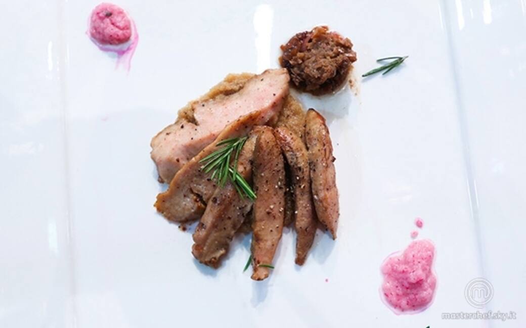Impiattare utilizzando un coppapasta: mettere l'amaranto al centro del piatto, fare una composizione in forma di stella con la carne con sopra l'amaranto. In diagonale su lato opposti mettere con il biberon la crema di ravanelli. Sempre con coppapasta piccolo sul lato in alto a destra mettere la crema di melanzane con la salsa rimata della carne. Finire la decorazione con piccoli rami di rosmarino.