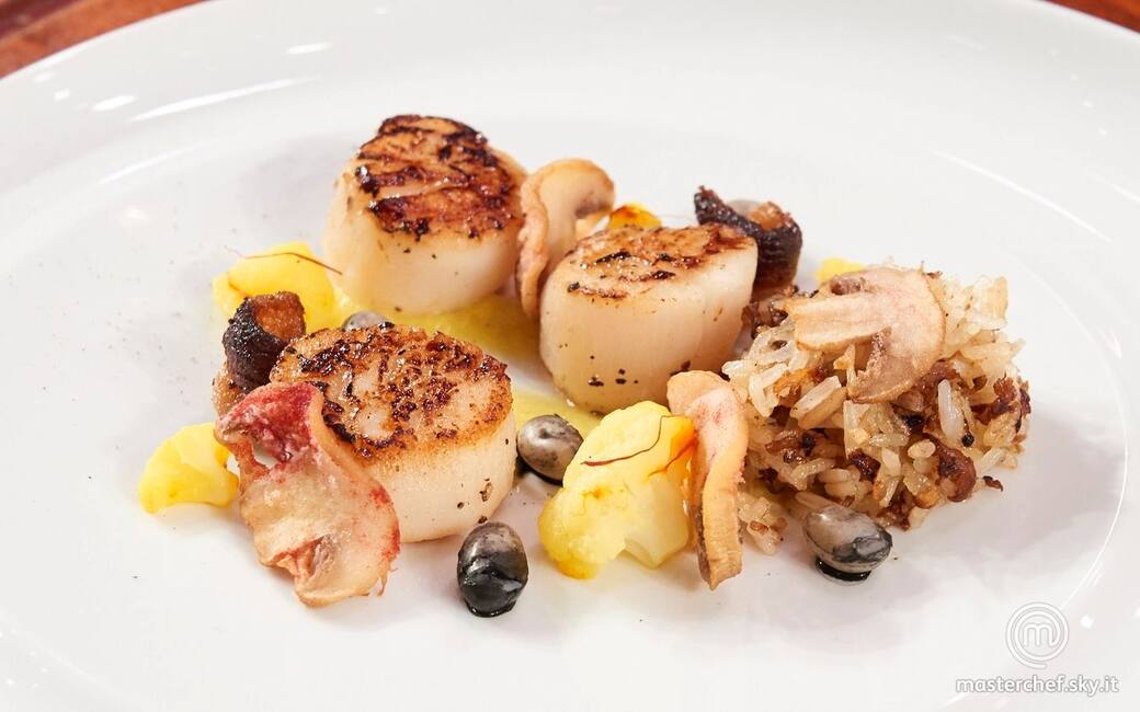 Impiattare disponendo un letto di crema di cavolfiore sul piatto. Disporre le capesante, le cime di cavolfiore tenute da parte, una quenelle di riso croccante, i funghi fritti, i fagioli croccanti e il lardo croccante. Aggiustare di sale e pepe.