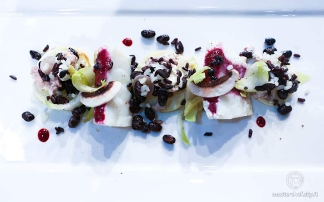 Servire alla base le cialde bianco/nere, sopra quelle nere mettere asparagi, indivia cruda condita, e riso nero. sulle cialde bianche invece posizionare fagioli, ricotta, funghi e riso bianco. adagiare le fette di merzullo a cavallo tra le cialde, nappando la superfice con la salsa alle more.