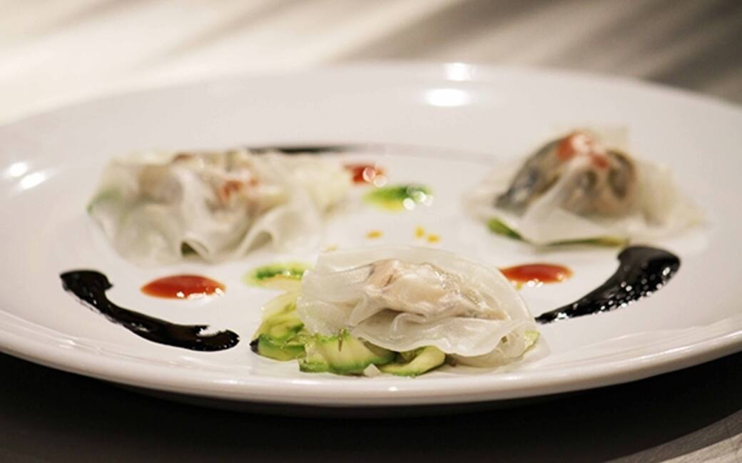 Per i ravioli in carta di riso aprire le ostriche e tenere la loro acqua da parte. Spennellare le ostriche con una soluzione di acqua e sale per togliere eventuali residui di madreperla, quindi metterle in un colino a spurgare, raccogliendo la loro acqua, per 10 minuti. Rinvenire in acqua tiepida 1/3 dei fiori di giglio per 5 minuti. Portare a bollore l’acqua della vaporiera aromatizzandola con 1/3 dei fiori di giglio ed il cardamomo precedentemente tostato in padella. Tagliare le ostriche in 4 e unirle ai fiori di giglio strizzati e spezzettati in una ciotola. Dividere la fetta di salmone in tre parti ammollare la carta di riso in acqua tiepida un foglio alla volta, quando diventa morbida stendere un foglio sul tagliere.