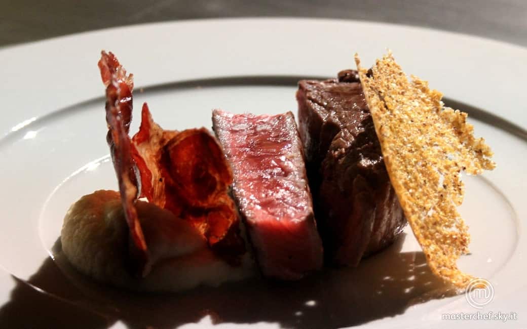 Impiattare adagiando il purè di sedano rapa, il filetto e il controfiletto porzionati e un pezzo di cialda alla polenta. Aggiustare di sale e pepe.