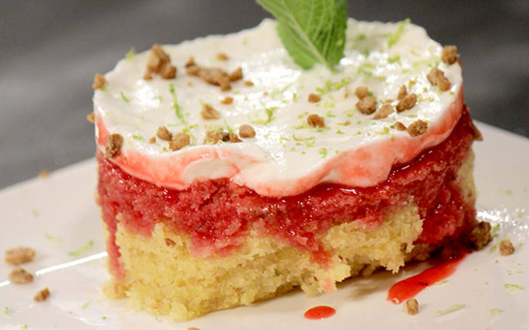 Iniziare preparando l’impasto del dolce. Sbattere i 220g di burro ammorbidito con i 180g di zucchero di canna finché il composto risulterà abbastanza omogeneo. Aggiungere un uovo alla volta e quando saranno amalgamati bene, aggiungere la farina, le nocciole tritate, la vaniglia, il succo e la buccia grattugiata dei lime e la menta. Versare l’impasto in uno stampo per dolci di 28cm di diametro e infornare a 180° per circa 30-35 minuti.