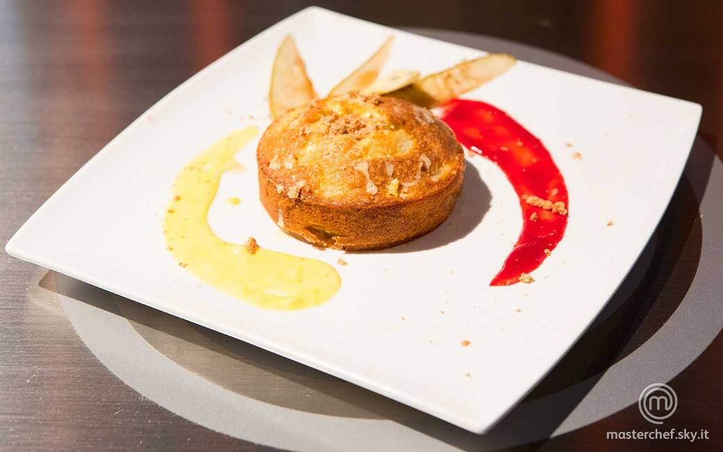 Scavare i tortini creando un piccolo buco sulla cupola e all'interno mettere poca crema al Blu di Morozzo, quindi coprire il buco con un paio di amaretti sbriciolati. Completare il piatto con la coulis di lamponi e il resto della crema inglese, guarnendo con le fettine di pera su cui versare un filo di caramello.