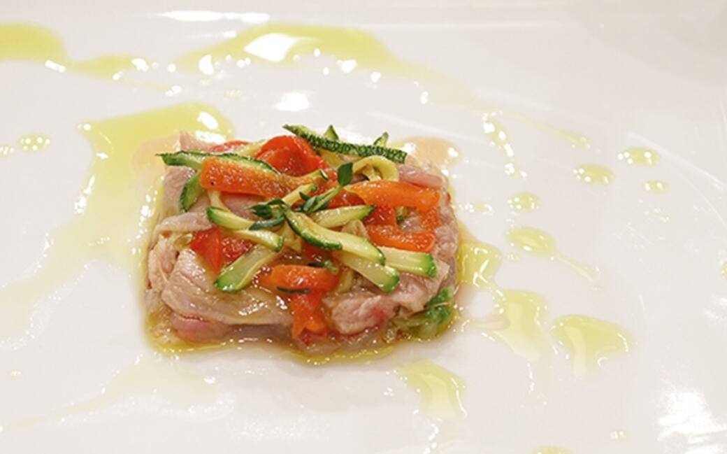 Impiattare con un coppa pasta quadrato alternando la carne, le scarole, i gamberoni, le zucchine. Condire con il fondo preparato con le arance e completare con un filo di olio.