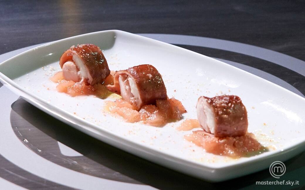 Impiattare disponendo delle porzioni di composta di pesche e disporvi sopra i lombi ripieni tagliati a fette. Decorare con la granella di mandorle e aggiustare di olio evo, sale e pepe.
