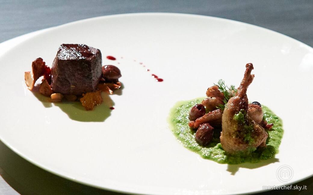 Impiattare disponendo una base di crema di scarola del piatto. Disporvi le cosce di quaglia e il petto e decorare con finocchietto. Dall’altra parte impiattare i finferli e il controfiletto e irrorare con riduzione al vino rosso. Aggiustare di olio evo, sale e pepe.