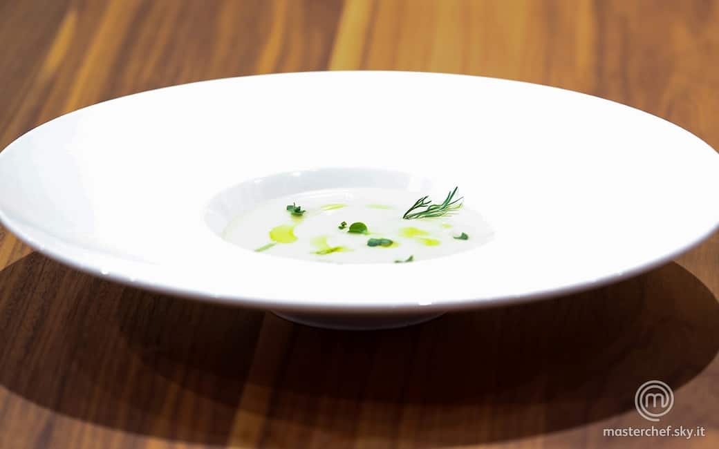 Preparare la crema di patate facendo soffriggere il cipollotto a pezzetti nel burro, aggiungere le patate a tocchetti e coprire con latte e acqua. Lasciare cuocere con coperchio fino a quando le patate diventeranno morbide. Frullare ottenendo una crema fluida, salare e pepare, poi passarla al colino per renderla più setosa.
