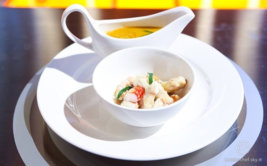 Versare in una ciotola qualche cucchiaio di crema di datteri e adagiarvi sopra i cubi di pesce, cozze, vongole, gamberi e scampi. A parte servire il brodo di pesce caldo mettendo in infusione qualche foglia di menta. Versare davanti al commensale il brodo sul pesce.
