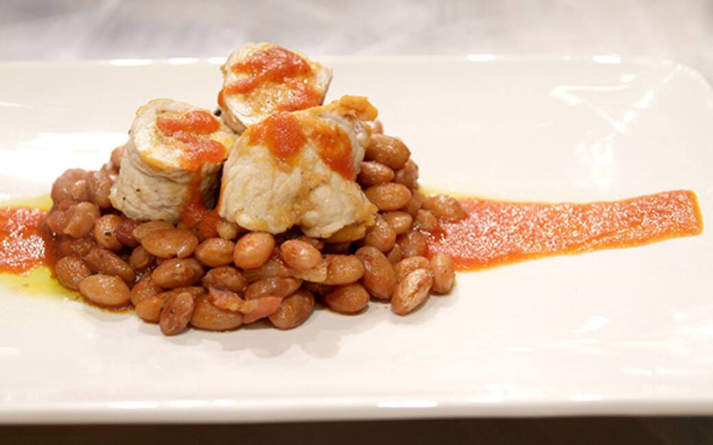 Con i fagioli borlotti utilizzare lo stesso procedimento dei cannellini ma al posto della salsiccia usare lo speck. Impiattare i fagioli borlotti e adagiare sopra gli involtini tagliati a metà con un po' di salsa di pomodoro.