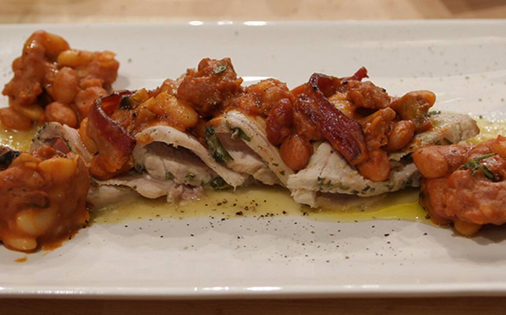 Tritare la cipolla, far soffriggere e aggiungere l’arista. Tenere da parte la carne e frullare il sugo di cottura con la cipolla.