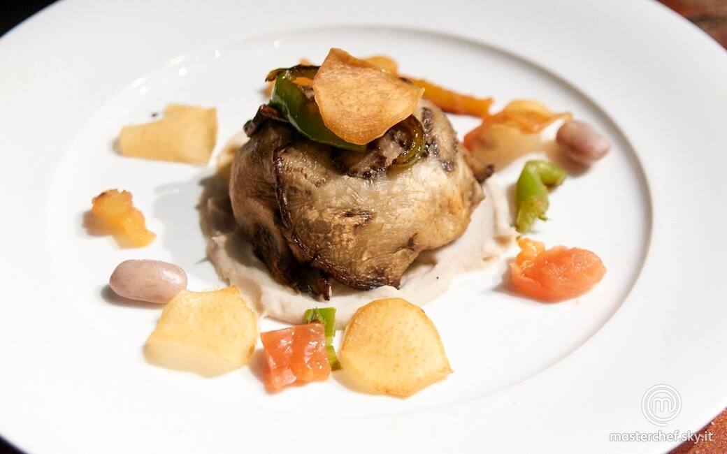 Impiattare disponendo la crema di fagioli sul fondo del piatto, adagiare il fagottino e decorare con verdure. Aggiustare di sale e pepe.