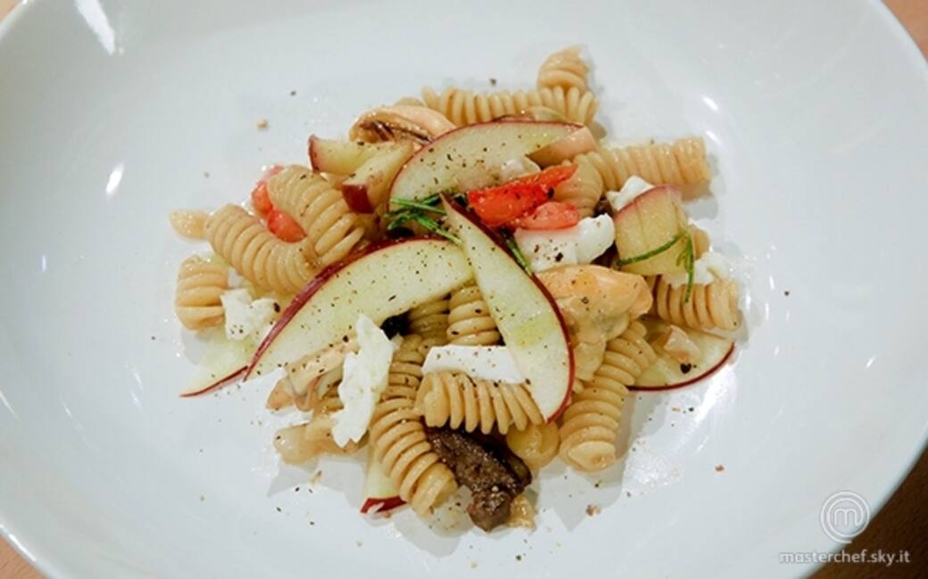 Adagiare sul fondo del piatto quattro spicchi di mela disposti a fiore, disporvi i fusilli, aggiungere quindi dei tocchetti di mozzarella, un rametto di rosmarino e spolverare il tutto con del pepe abbondante.