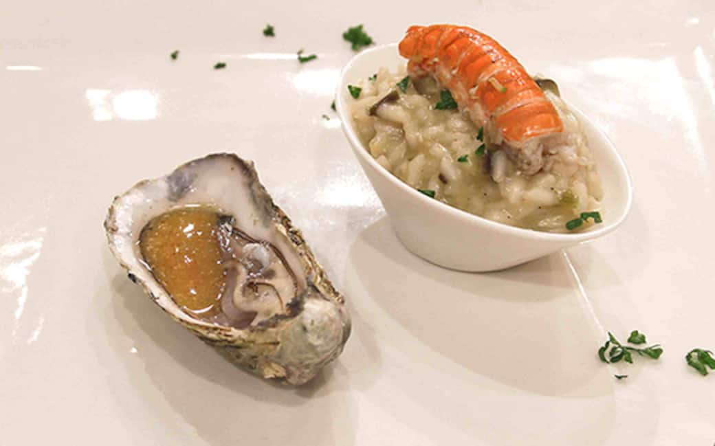 Servire il risotto in una cocotte, spolverate con prezzemolo trito e adagiarvi sopra lo scampo. Accompagnarlo con un’ostrica sulla con una goccia d’aceto e una d’olio evo. Aggiungete al lato del muscolo un cucchiaio di vellutata di fichi piccante.