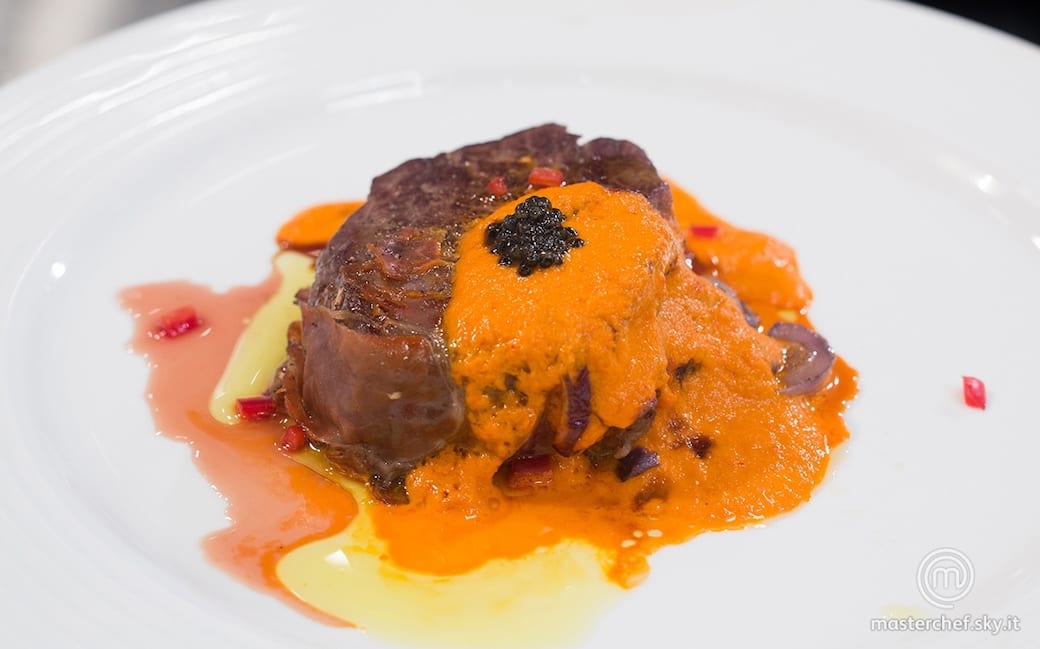 Disporre la salsa a specchio, adagiarvi sopra il filetto e accompagnare con gli anelli di cipolla e il caviale.